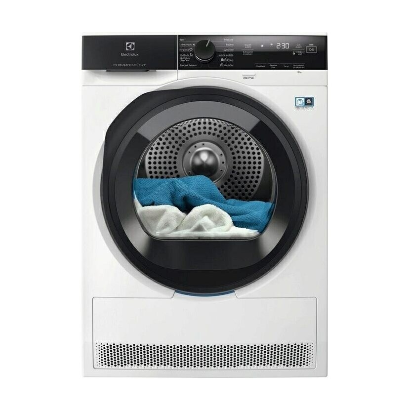 Sušička prádla; Electrolux 700 DelicateCare EW7D495UCC; Hlavní technologie: DelicateCare; Konektivita: Ano; En. třída: C; Kapacita sušení (kg): 9; Způsob sušení: Tepelné čerpadlo; Hlučnost (db): 63; Vnitřní osvětlení bubnu: Ano; Parní programy: Ne; Time Manager/úspora času: Ano; Outdoor program: Ano; Programy pro vlnu a hedvábí: Ano; Woolmark: Blue; Rozměry VxŠxHxH max. (mm): 850x596x636x659; Motor: Invertor motor se zárukou 10 let; Displej: LED displej; Standardní vybavení: Hřeben na čištění kondenzátoru; 5 let záruka na celý model: Ne; Spotřeba energie kWh/100cyklů: 106;