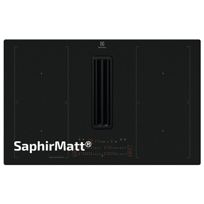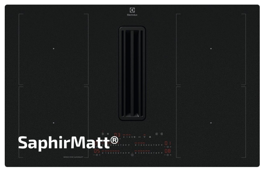Kombinovaná varná deska s odsavačem, Barva: Černá matná SaphirMatt®, Šířka: 80 cm, Možnost zapuštění do roviny, Ovládání pomocí posuvného slideru každé zóny zvlášť, PowerBoost, 2x spojení varných zón, Prostor pro instalaci (VxŠxH): 217x780x490 mm, Výkon odsávání: 465 m3/h, Průměr odtahu: 150 mm, Směr odtahu: Spodní, Možnost recirkulace i odtahu ven