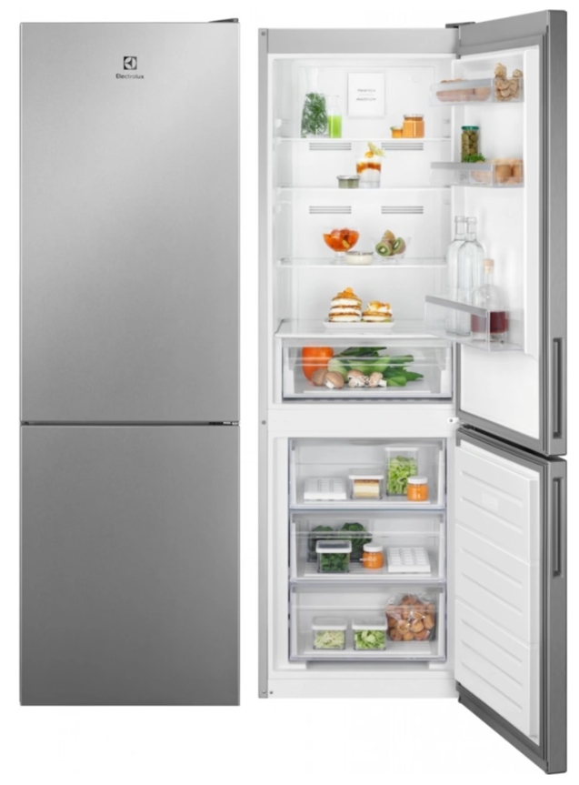 Chladnička kombinovaná s mrazákem dole NF; Electrolux 600 TwinTech LNT5ME32U1; Výška (cm): 186; Technológia: No Frost; En.třída: E; Čistý objem chladničky/mrazničky (l): 230 / 101; Ovládání: Elektronické, interní; Displej: Ne; Hlučnost (dB): 38; Ventilátor: MultiFlow; Nízkoteplotní zásuvka: ExtraChill; Custom Flex: Ne; Barva: Nerezový vzhled; Motor: Invertor ; Rozměr VxŠxH (mm): 1860x595x650; Madla: Integrované vertikální